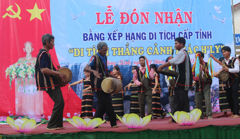 Bà con đồng bào dân tộc thiểu số ở xã Sông Hinh biểu diễn trống đôi, cồng ba, chiêng năm tại lễ đón nhận Bằng xếp hạng di tích cấp tỉnh thắng cảnh thác H’Ly. Ảnh: NGÔ XUÂN