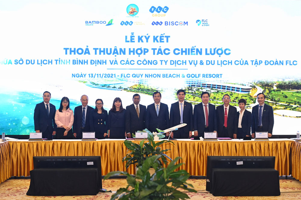 Lãnh đạo Tổng cục Du lịch, Hiệp hội Du lịch Việt Nam và các tỉnh khu vực miền Trung trong lễ ký kết hợp tác, liên kết sản phẩm giữa các doanh nghiệp với ngành Du lịch các địa phương để phục hồi du lịch sau COVID-19 tại Bình Định. Ảnh: DOÃN CÔNG |