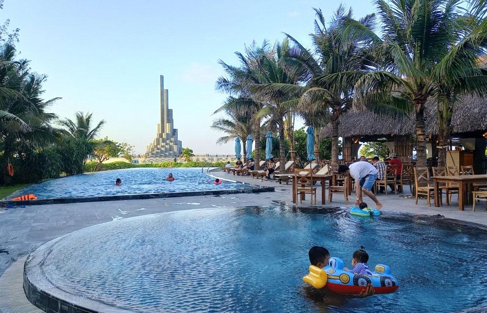 Du khách tắm hồ nước ngọt, cà phê ở Stelia Beach Resort và ngắm tháp Nghinh Phong, biểu tượng check-in mới của TP Tuy Hòa – Phú Yên. Ảnh: TRẦN QUỚI