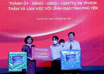 Lãnh đạo tỉnh tiếp nhận món quà của TP Hồ Chí Minh hỗ trợ công tác phòng, chống dịch. Ảnh:...