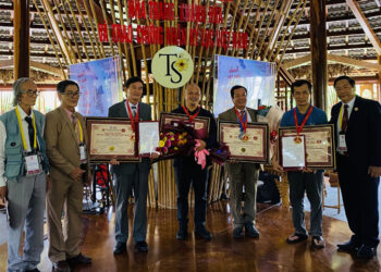 Nhà báo Phạm Lê Quốc Cường (thứ 4 từ trái sang) được trao xác nhận kỷ lục Việt Nam. Ảnh:...
